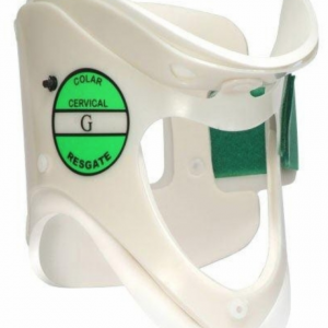 Produto destinado a imobilização da coluna cervical. Possui apoio mentoniano e occiptal. Sua ampla abertura frontal permite checar o pulso carotídeo e realizar procedimentos de traqueostomia. Aberturas na parte posterior proporcionam a ventilação do local e permitem verificar o escoamento de fluídos, tais como o sangue. Ortopratika Tamanho: G